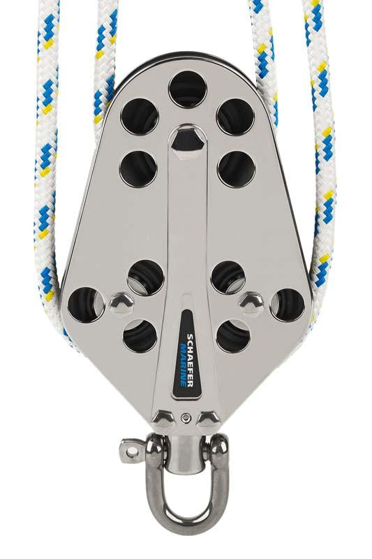 10 Series Fiddle Block with Stainless Steel cheeks and Aluminum "universal circuit" ball bearing sheaves. Works with 10-55-uc for a powerful 4:1 system. Aluminum sheaves run on Delrin(tm) ball bearings for a very strong yet low-friction sheave. Unique single top sheave and two in-line sheaves spread the load reducing friction and chafe. Stainless Steel D shackle run on a swivel head that may be locked in plate to avoid line twist. Bolted construction allows for easy maintenance.