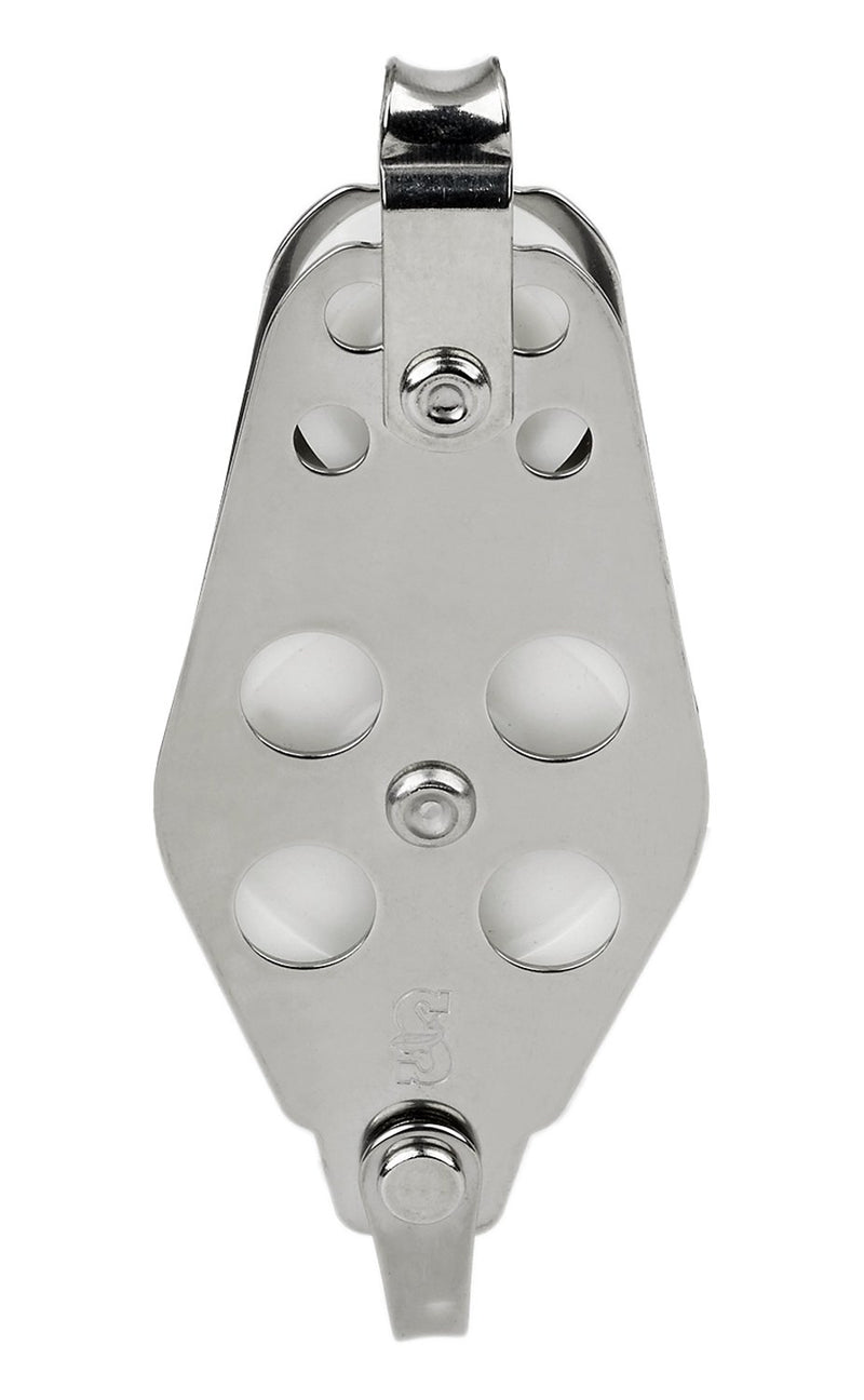 Fiddle block with side shackle and becket. Works with 02-43 for a 4:1 purchase. Delrin(tm) sheaves on plain bearings ensure smooth operation and high safe working load.