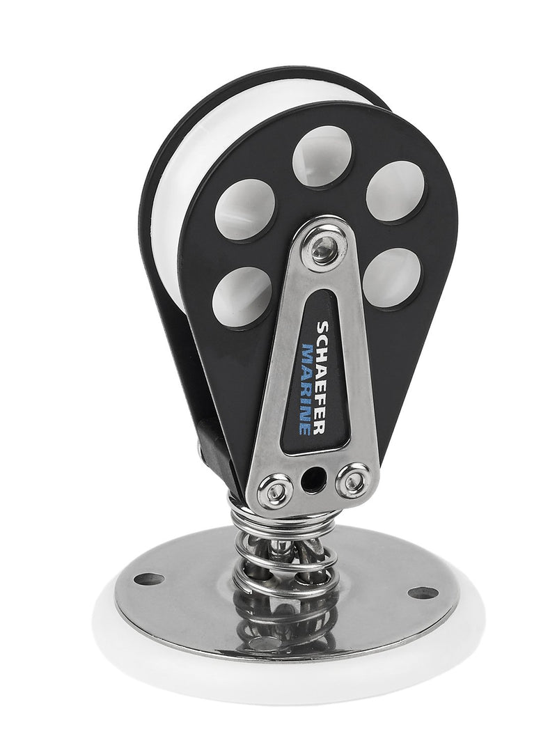 Stand Up Spring Block swivels 360' and uses a Delrin(tm) Sheave. Large Diameter Base distributes loads. Delrin(tm) Base included. Boats to 34'.