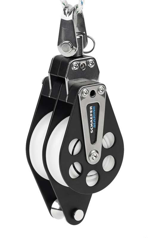 Double block with ball bearing sheaves and becket. Works with 706-25 for a 4:1 purchase. Removable becket allows pre-spliced lines to be easily attached. Swivel head design may be locked in place to eliminate twists. Delrin(tm) ball bearing sheaves provide low-friction yet high safe working load.