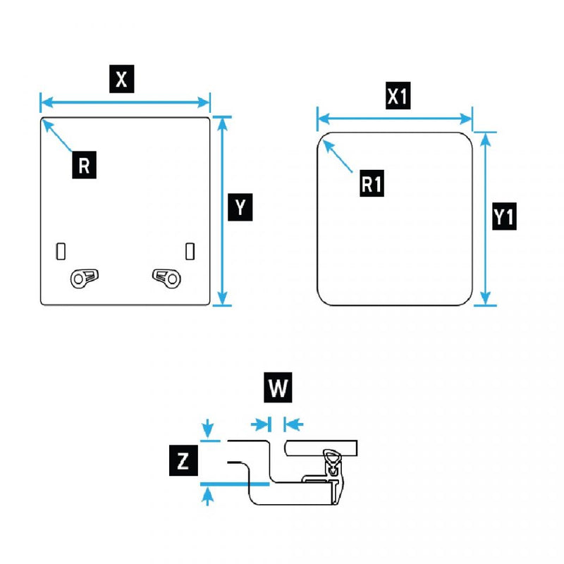 | Length X (in) | Width Y (in) | Height Z (in) | Raddii R (in) | Cut-Out Length X1 (in) | Cut-Out Length Y1 (in) | Cut-Out Length R1 (in) |