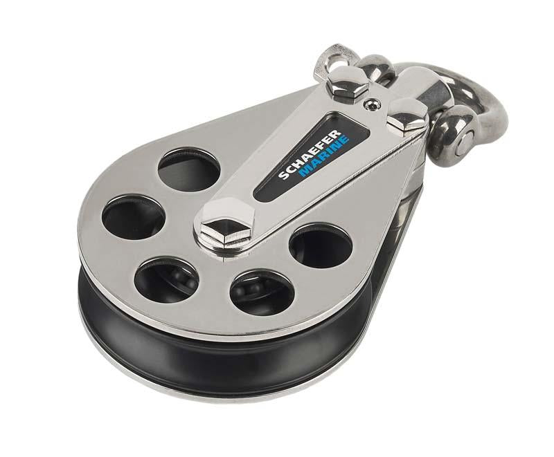 10 Series Single Block with Stainless Steel cheeks and Aluminum "universal circuit" ball bearing sheave. Aluminum sheave run on Delrin(tm) ball bearings for a very strong yet low-friction sheave. Stainless Steel D shackle run on a swivel head that may be locked in plate to avoid line twist. Bolted construction allows for easy maintenance.