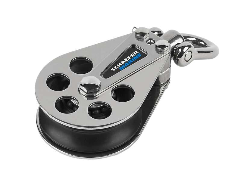 8 Series Single block with Stainless Steel cheeks and Aluminum "universal circuit" ball bearing sheave. Aluminum sheave run on Delrin(tm) ball bearings for a very strong yet low-friction sheave. Stainless Steel D shackle run on a swivel head that may be locked in plate to avoid line twist. Bolted construction allows for easy maintenance.