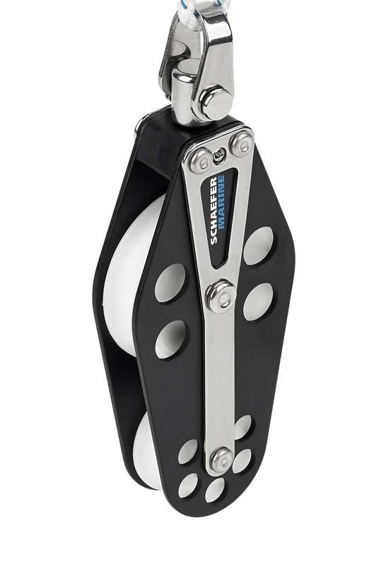 Fiddle block with anodized aluminum cheeks. Works with 504-75 or 504-76 for a 4:1 purchase. Delrin(tm) sheaves ensure smooth operation and high safe working load. For boats to 28'.