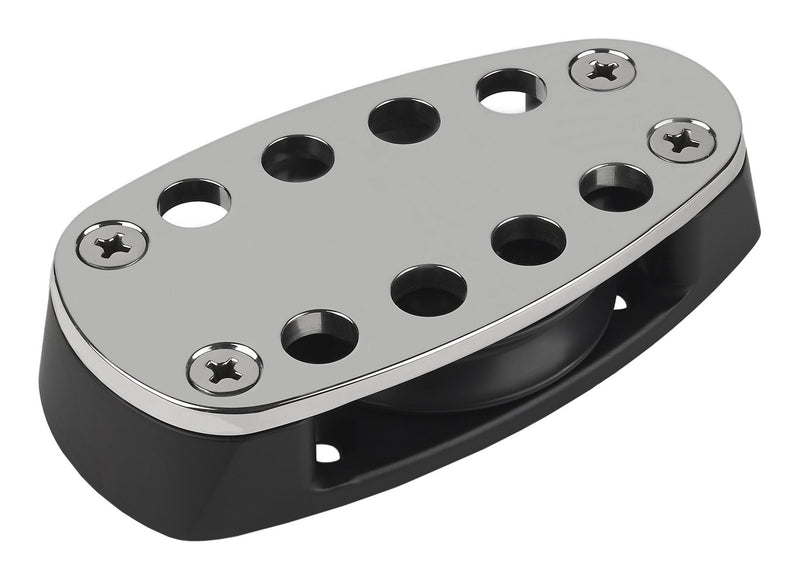 37-55 Single Stainless Steel Foot Block. Computer machined base features aluminum sheaves with our nomex(tm)/Teflon(tm) bearing and Delrin(tm) ball bearings for a low-friction high strength block. Stainless Steel Top plate is easily removed for installation. Wide computer machined aluminum base spreads loads over a wide area.