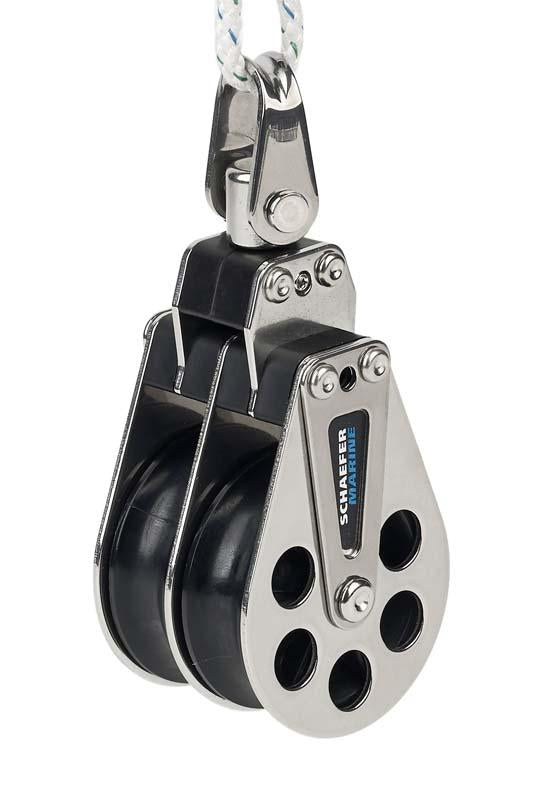 Double block with Stainless Steel cheeks. Works with 705-35 for a 4:1 purchase. Delrin(tm) sheaves enable smooth operation with high safe working loads. Swivel head may be locked in place to eliminate twists.